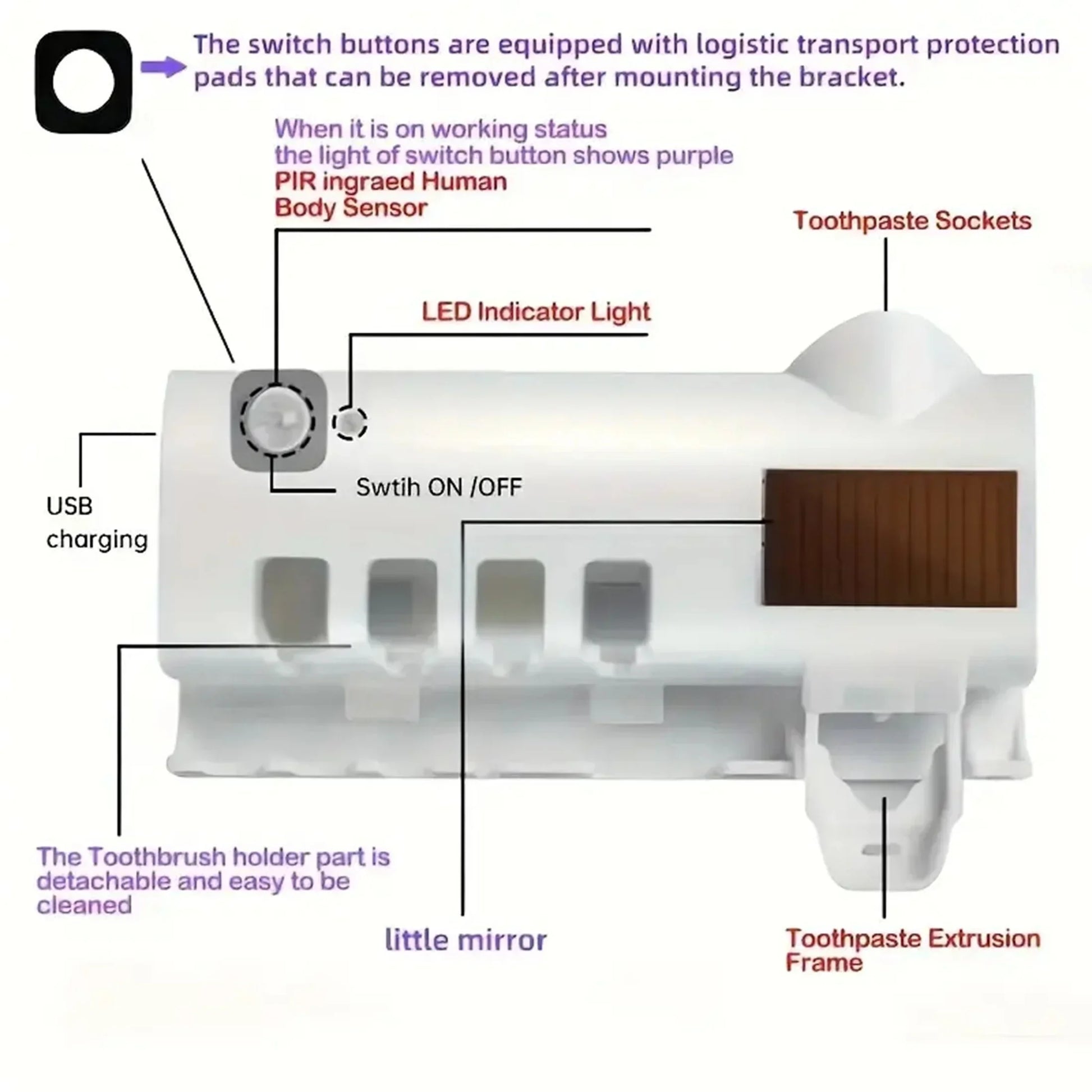 - Fonctionnalités : Capteur infrarouge PIR, lumière indicateur LED, cadre d’extrusion de dentifrice, petit miroir